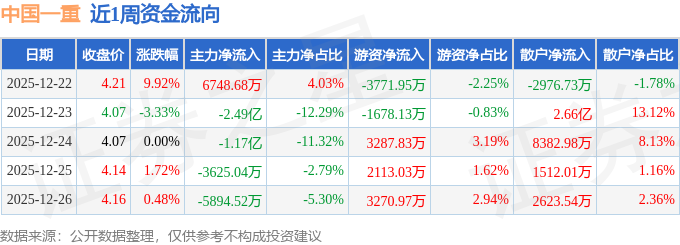 资金流向数据方面,本周中国一重主力资金合计净流出3.93亿元,游资资金合计净流入3221.76万元,散户资金合计净流入3.61亿元。本周资金流向一览见下表: