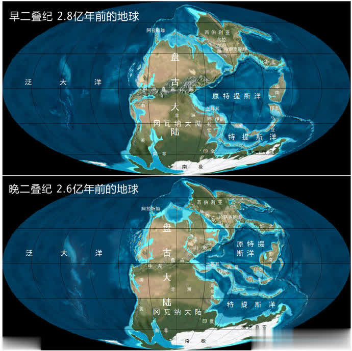 二叠纪是古生代的最后一个纪,大陆板块闭合到了末期,全球形成一块超级盘古大陆,地球具有广阔的陆地面积,连亘在大陆中央的中央盘古山脉贯通了南北泛大陆,睥睨山河。