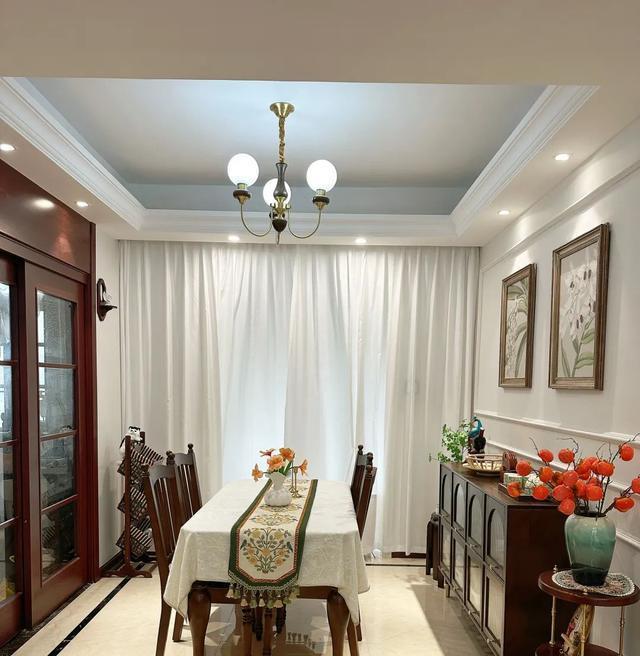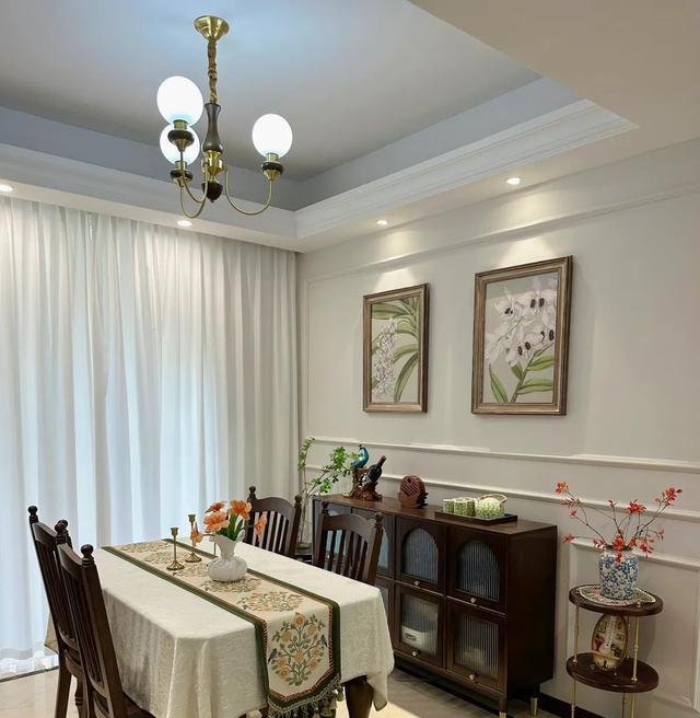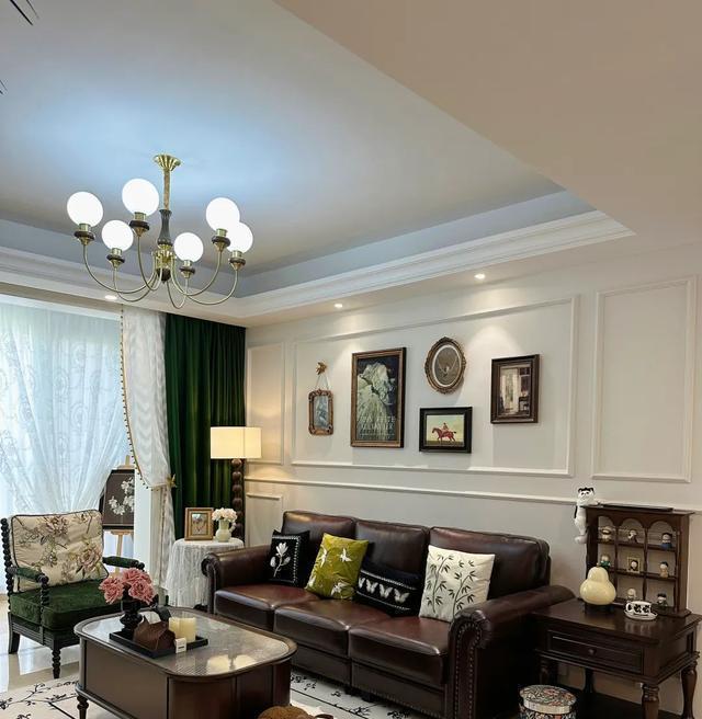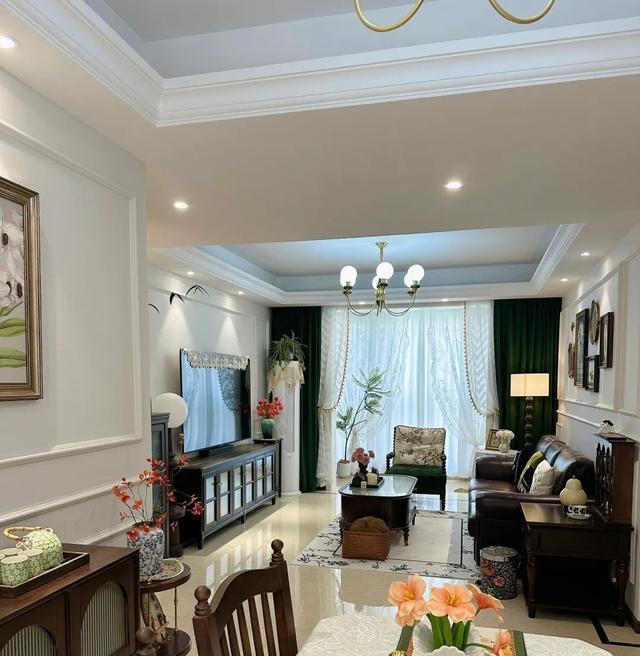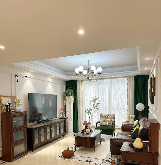 窗帘的搭配也很有层次感,厚重的墨绿色窗帘显得高贵沉稳,而白色轻纱帘则给整个空间带来一种柔和的光线,不至于让房间太过沉闷。