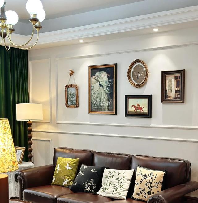 挂画有古典人物和马的图案,带着浓浓的复古味,画框间的距离处理得恰到好处,没有拥挤感,整个墙面显得很有艺术氛围。