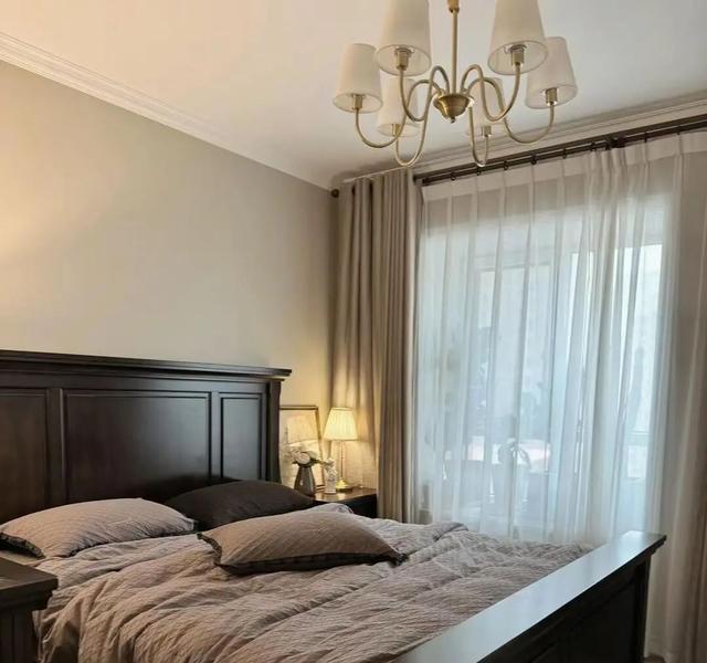卧室,吊灯用的是经典的黑色铁艺设计,线条优雅弯曲,仿佛像伸展的树枝一样,灯座有种蜡烛造型的感觉,带有浓浓的复古风情。