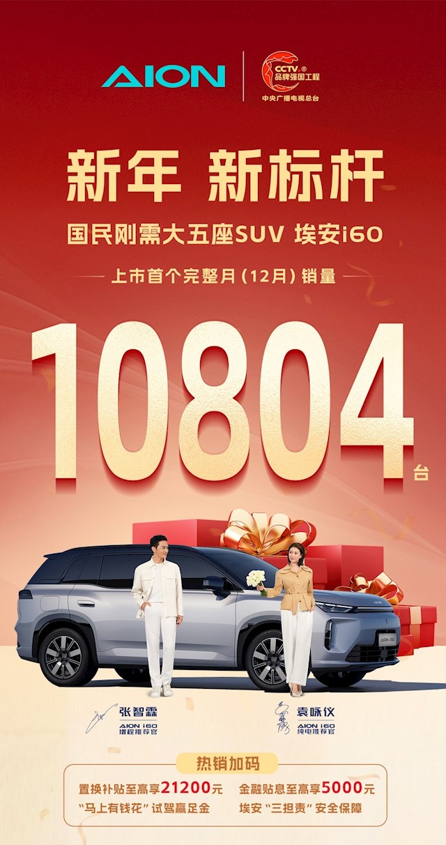 快科技1月2日消息,广汽埃安官宣,旗下紧凑型SUV车型i60在上市首个完整交付月(12月)销量突破10000台,达到10804台