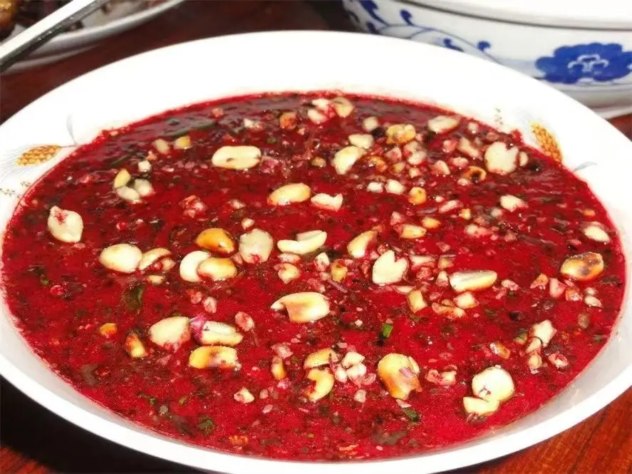 所谓“旺”指的是生鸡血,将大蒜、薄荷、花椒粉等调味料加入生血搅拌,等到生鸡血的颜色从鲜红色变成褐色,说明生鸡血已经“辣”熟,然后再加入鸡杂。