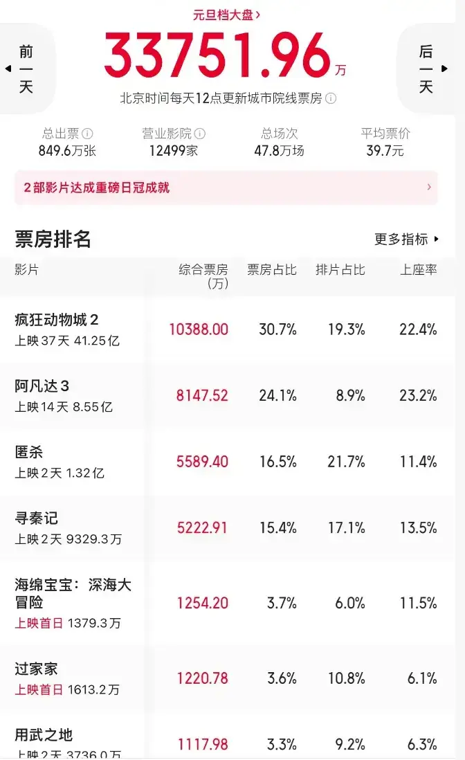 看看昨天的单日票房吧,总票房是3.3亿,其中,《疯狂动物城2》就拿了1个亿,这一部上映了一个多月的电影,现在还能这么强势,真的是始料未及啊。