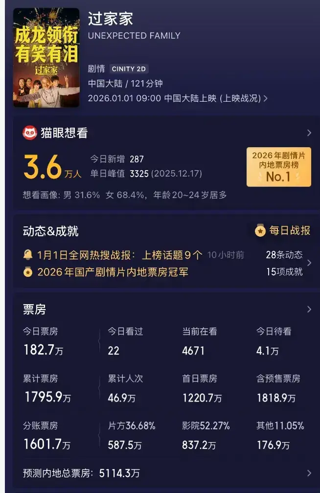 因此,成龙的《过家家》拿了一千多万也是不出意料的,因为这一部电影的热度太低,就连10%的排片都没有撑得起。