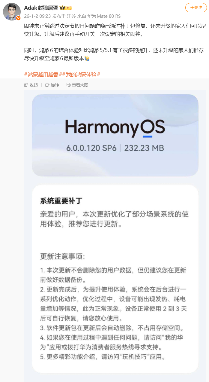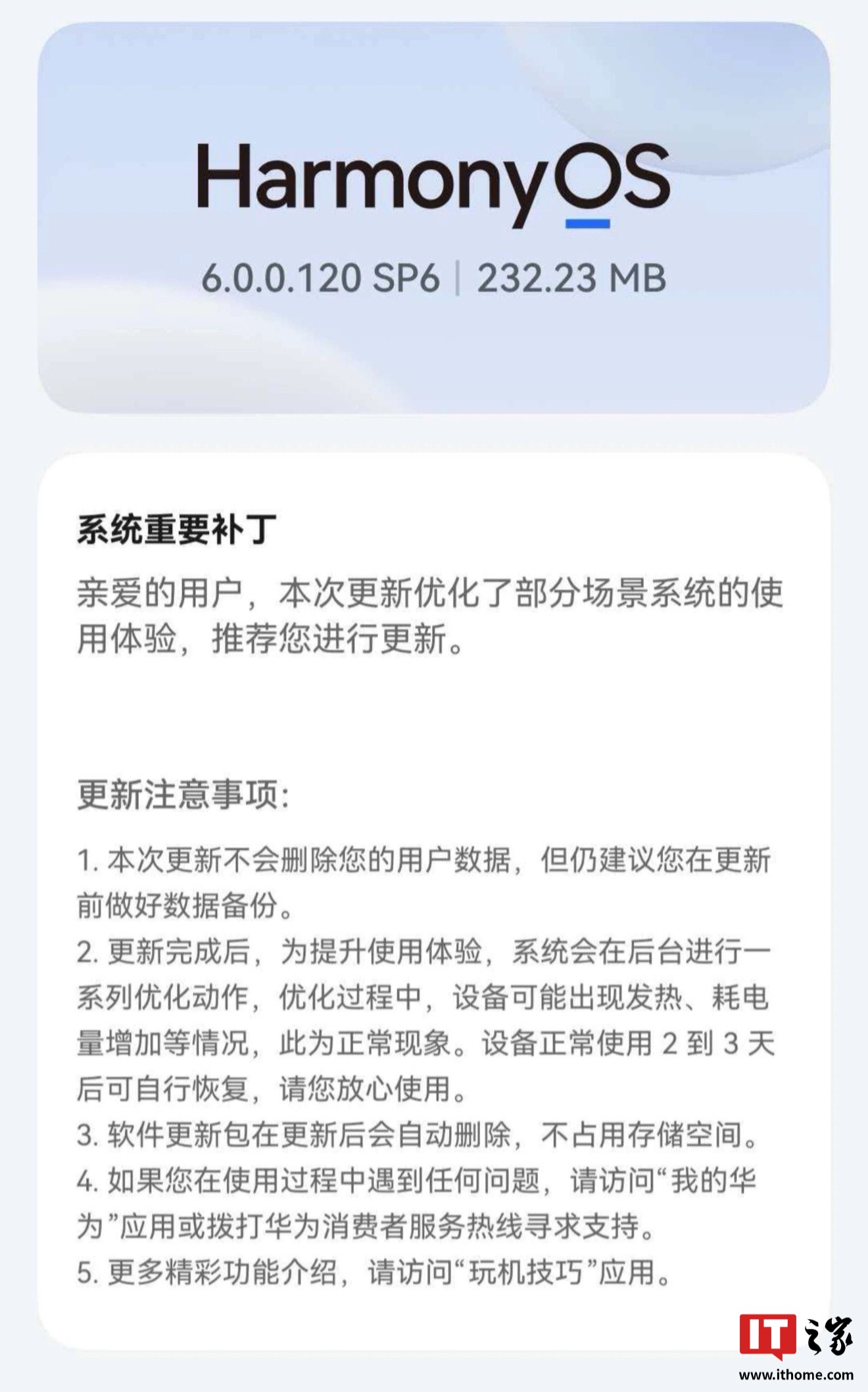 IT之家 1 月 2 日消息,华为鸿蒙系统 6.0.0.120 SP6 更新现已推送,主要优化了系统使用体验。 IT之家附更新内容如下: 系统重要补丁亲爱的用户,本次更新优化了部分场景系统的使用体验,推荐您进行更新。 博主 @Adak封狼