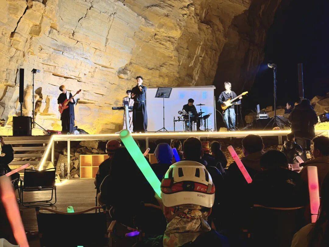 《平凡之路》的洒脱、《稻香》的治愈、《春风十里》的温柔……一首首耳熟能详的歌曲接连唱响,观众们一边挥舞着手中的荧光棒、一边轻声跟唱,歌声、光影与洞穴中湿润的空气交融在一起,酿成了独属于大溪沟的浪漫。
