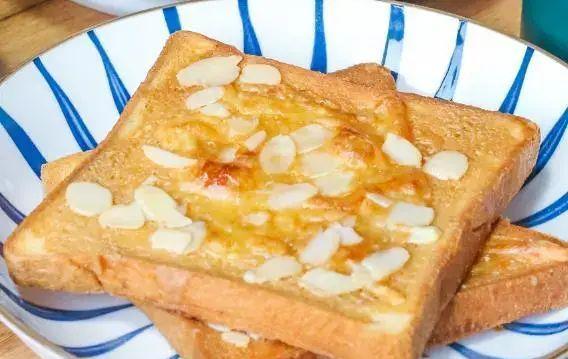 3.然后抹在土司上,撒上一层奶酪,一层杏仁片,180度烤15分钟。超级好吃。