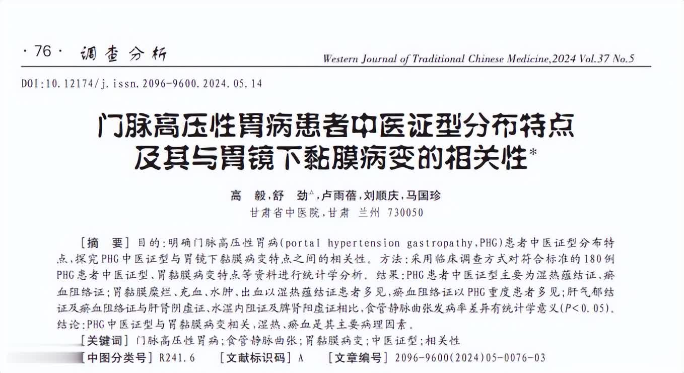 [1] 高毅.门脉高压性胃病患者中医证型分布特点及其与胃镜下黏膜病变的相关性, 西部中医药, 2024-05-15