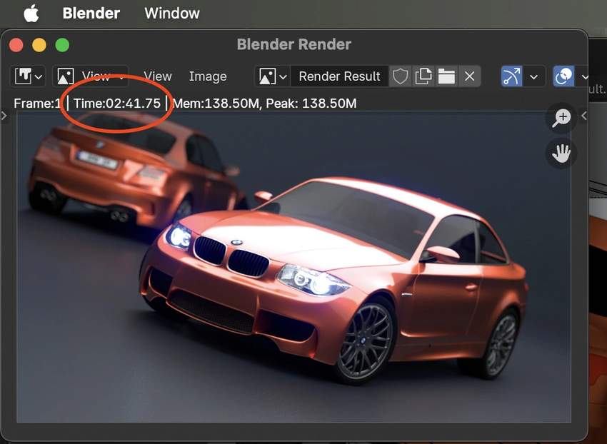 Blender 3D渲染中,使用公开的宝马车场景,CPU渲染单帧,Mac mini M4耗时2分42秒(162秒,时间越短、性能越好)。