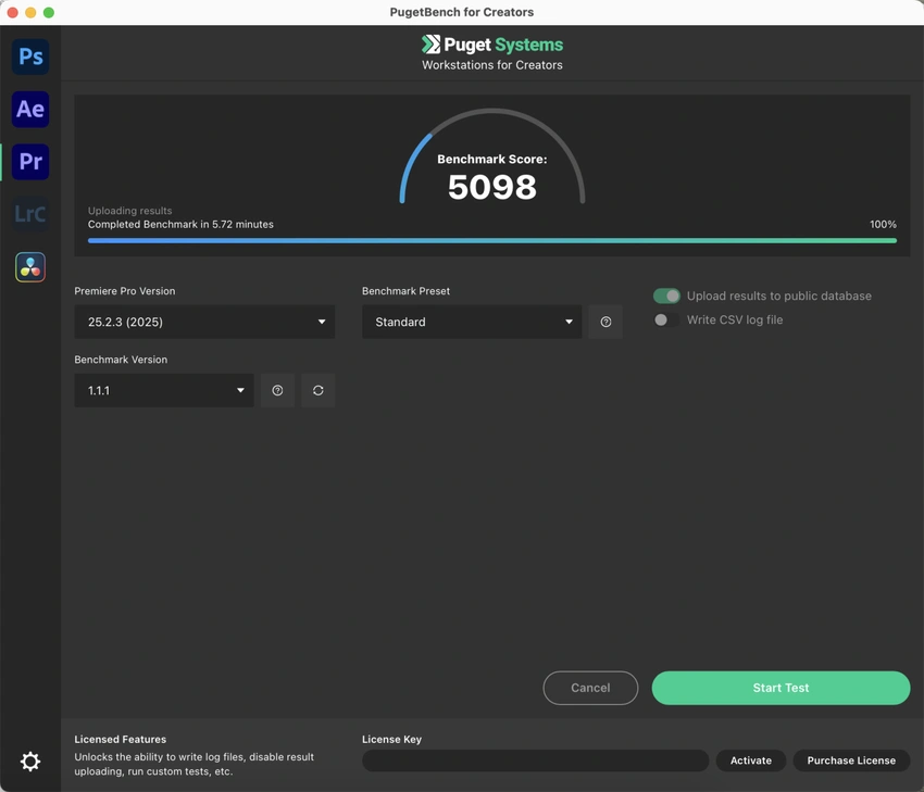 PugetBench是由Puget Systems开发的基准测试工具套件,它可以直接调用PS、Pr等专业软件的功能模块,通过批量处理、视频渲染等操作模拟真实工作负载,可以较为准确的评估专业软件在真实工作场景下的硬件性能表现。