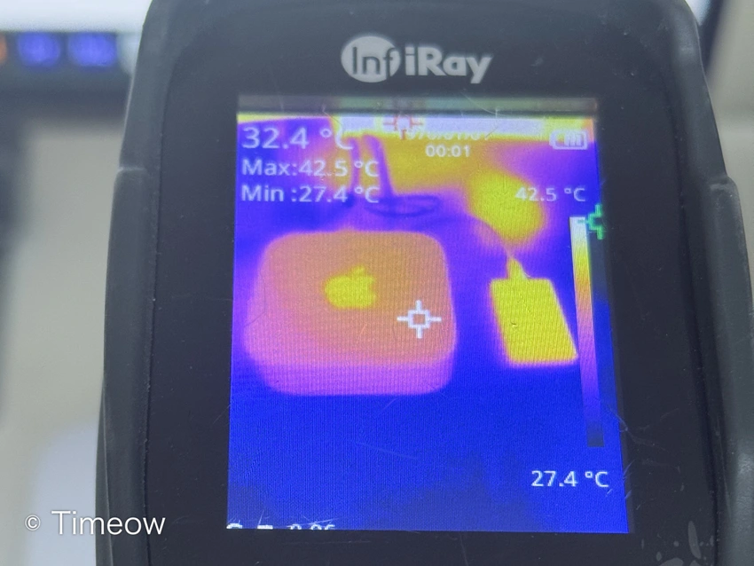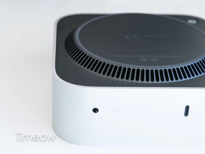 来看底部。首先,作为功耗不高的小设备,Mac mini底部散热孔设计为凸出的边缘,一半进气、一半出热风可以轻松搞定散热。同时苹果的散热偏保守,优先保静音,所以日常使用噪音也不高、基本无打扰,非常适合桌面使用。但满负载运行的时候,内部芯片会有点热,可能会出现降频的问题,满负载下,和散热能力中等的Windows迷你主机类似了。
