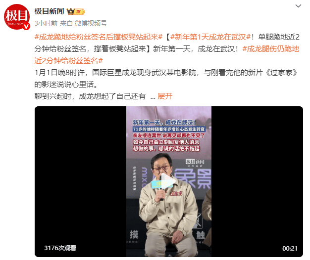 记者注意到,见面会结束后,成龙接下前排粉丝递上的一堆照片,自己跑到一个角落里,单腿跪下给大家签名,签了近2分钟后才撑着板凳站起来。新年的第一天,巨星与影迷在武汉双向奔赴了!