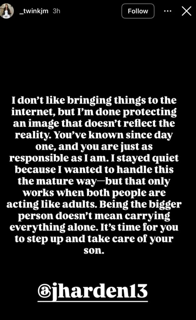 凯尔西-M写道:“我本不想把这种事闹到网上,但我再也不想为一个名不副实的形象买单了。从一开始你就知道真相,你和我一样负有责任。我一直保持沉默,是因为想以成熟的方式处理这件事,但这需要双方都拿出成年人的态度。隐忍不代表要独自承担一切。现在是时候站出来,承担起对儿子的责任了,@jharden13。”