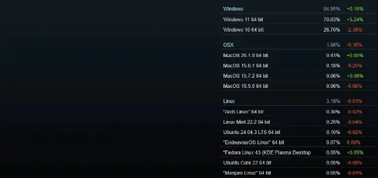 历史调查显示,2020 年 1 月微软停止支持时,Steam 上约有 14% 用户仍使用 Windows 7。随着 Windows 10 和 11 的普及,到 2024 年 1 月仅剩约 0.6%,虽然大幅下降,但仍有少量用户存在。此次 2025 年 12 月数据中 Windows 7 已从统计条目消失,但并不代表用户数真正为零,可能只是比例过低而未被列入调查。