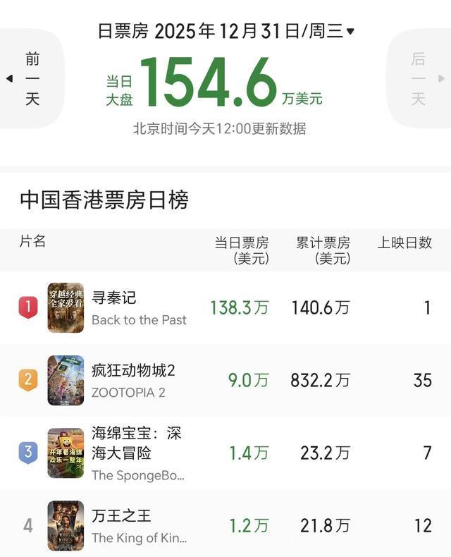 电影版《寻秦记》香港首日票房破1000万港币,以绝对优势打败《疯狂动物城2》,登顶香港日冠。