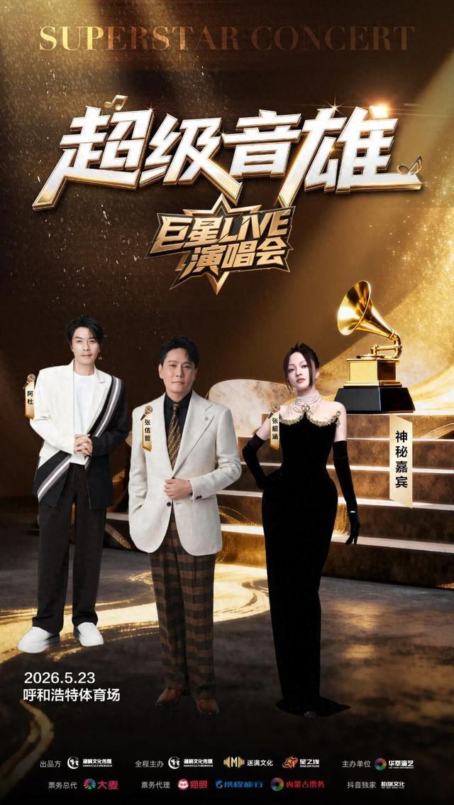 乐迷期待已久的年度盛事正式揭晓——"2026超级音雄 巨星LIVE 演唱会"将于2026年5月23日在呼和浩特体育场恢弘启幕! 本次演唱会由华语乐坛三大实力唱将张信哲、张韶涵、阿杜领衔,更有一位重量级神秘嘉宾登场