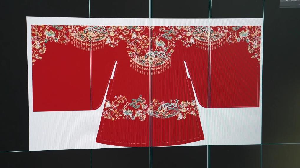 在海宁中国家纺城时尚面料设计中心,汉服设计师李珍珍正在数位板上勾勒线条。屏幕上,宋代画家赵伯驹笔下的《仙山楼阁图》与杭州西湖十景叠合,百合、金鱼等纹样点缀其间,寓意“百年好合”“金玉满堂”,这是一款独具匠心的婚服。