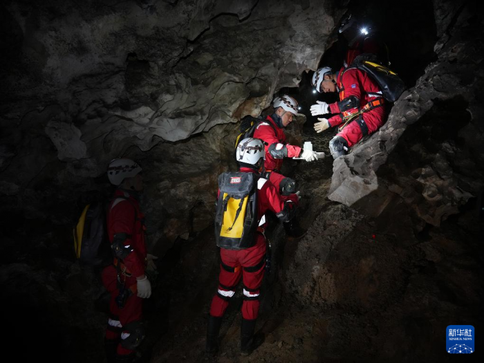 2025年12月,航天员在洞穴中进行物品传递协作训练。