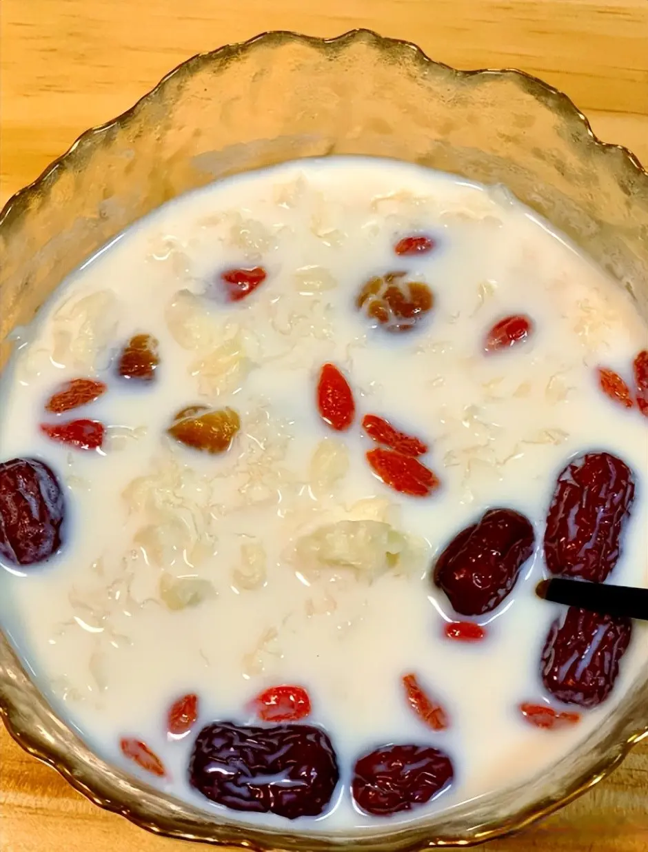 所需食材:银耳半朵、桂圆干10颗、红枣5颗、枸杞10粒、纯牛奶250毫升、冰糖适量、清水适量。