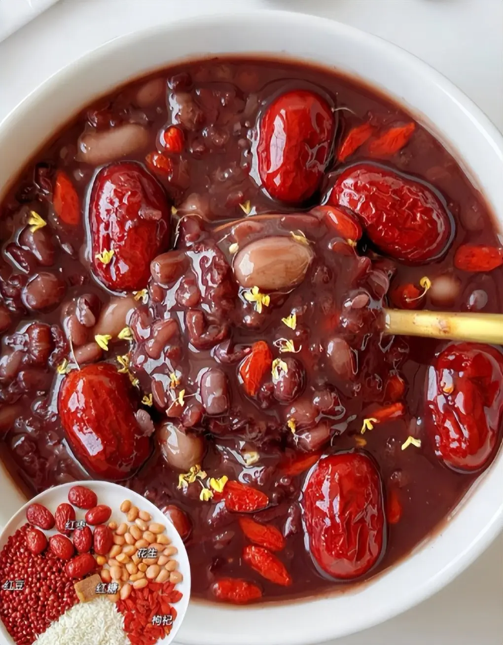 所需食材:红豆30克、红皮花生30克、红枣5颗、枸杞10粒、红糖适量、大米50克、清水适量。