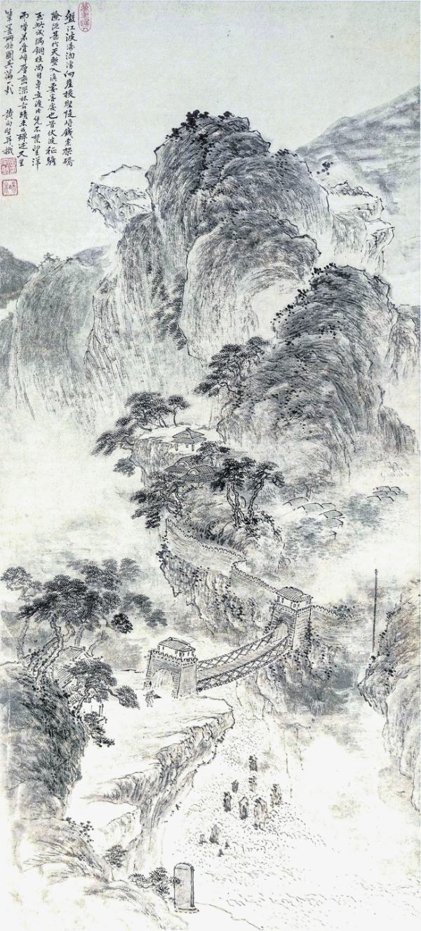 铁索桥作为寻亲路上最重要的桥梁之一,黄向坚重点着墨,现存二幅《盘江铁索桥》。一幅藏于苏州博物馆,一幅藏于贵州省博物馆。两图都是从盘江东岸关岭一侧,画向西岸晴隆。苏州博物馆《盘江铁索桥》收录于万里寻亲图册,画家视觉位于铁索桥南,尺寸与今A4纸相当。画中山势巍峨,河水湍急,城门坚固,铁索桥横卧江面,江中乱石锋利密布,宛如船帆。题跋:“盘江界黔地,源出吐蕃。水势奔涌,沸声如雷,不能施舟楫。昔尝絙铁索梁,以通往来,不致望洋而叹。当日伏波南征驻此,尚有铜柱卓立于城隅。”跋文中的“吐蕃”指云南。贵州省博物馆藏的《盘江铁索桥》,视觉位于铁索桥北。直幅,高107.5厘米,宽49厘米。画面恢弘,山路盘绕,江边陡壁和连云城墙浑然一体,形成屏障。画中人持伞躬身,准备渡桥。黄向坚并识:“盘江波涛汹涌,向崖拔壑,陡峙铁索架桥,险厄甚于天堑,入滇要害处也。昔伏波征骑至此,城隅铜柱尚自卓立。渡此,凭不禁望洋而叹。若叠嶂层峦,深林古迹未可殚述,又岂笔墨所能图其万一哉!”