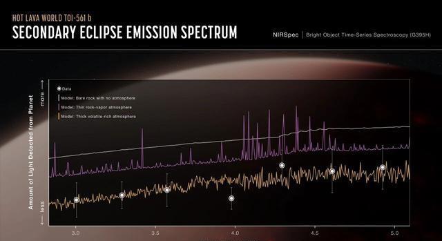 团队用韦伯的近红外光谱仪,测了TOI-561b的亮度变化:当行星转到恒星后面(“掩星”),望远镜能捕捉到行星自身发出的红外光。如果没有大气,白天的温度应该接近2700℃(铁完全融化的温度);但实际测到的是1800℃——虽然还是热得离谱,但比预期低了900℃。