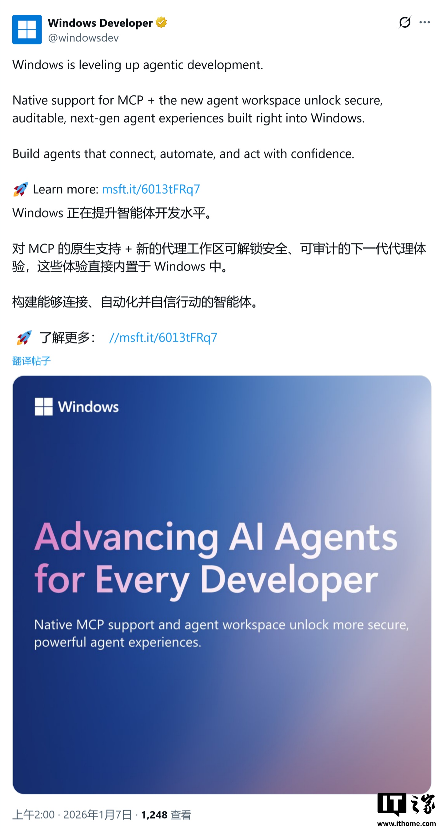 IT之家 1 月 7 日消息,微软官方 @windowsdev 账号今天(1 月 7 日)在 X 平台发布推文,宣布 Windows 11 将全面升级“智能体开发”(Agentic Development),并原生支持 MCP 协议。