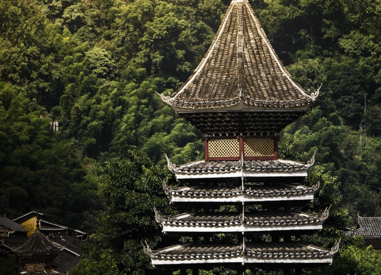 整座建筑无需一钉一铁,全凭榫卯咬合,结构严谨,稳固如山。鼓楼形如宝塔,以中心巨木为柱,拔地参天,犹如侗家人凝聚力的象征;风雨桥则横跨溪涧,在侗族文化中被视为连接生死、护佑村寨的“福桥”,因此常被倾心装饰,融桥、廊、亭、塔于一体,精美而恢宏。梁枋上的彩绘与雕刻,寄托着对风调雨顺、安康富足的美好祈愿。