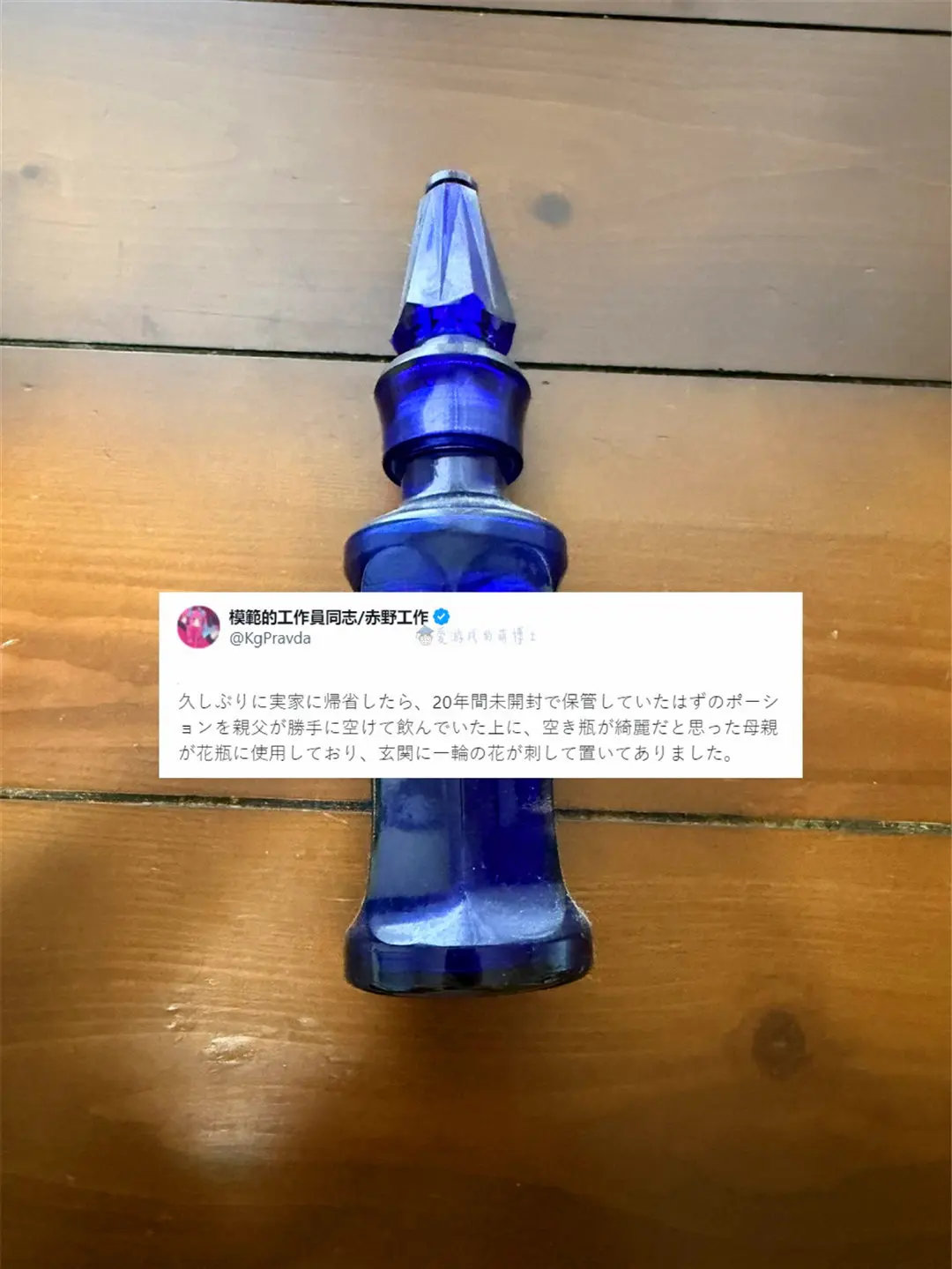 一位叫“赤野工作(社群ID为KgPravda)”的网友(其职业认证是作家)稍早在社群里分享了一段有趣的经历,配文为“时隔多年回到老家探亲,发现父亲竟擅自打开了那瓶本该封存二十年的药水,并且喝掉了,而母亲觉得空瓶子漂亮,竟把它当花瓶用了,玄关处插着一朵孤零零的花”。配图则是一个造型精致的蓝色小瓶子,观看次数短时间内突破了860万,火爆一时!