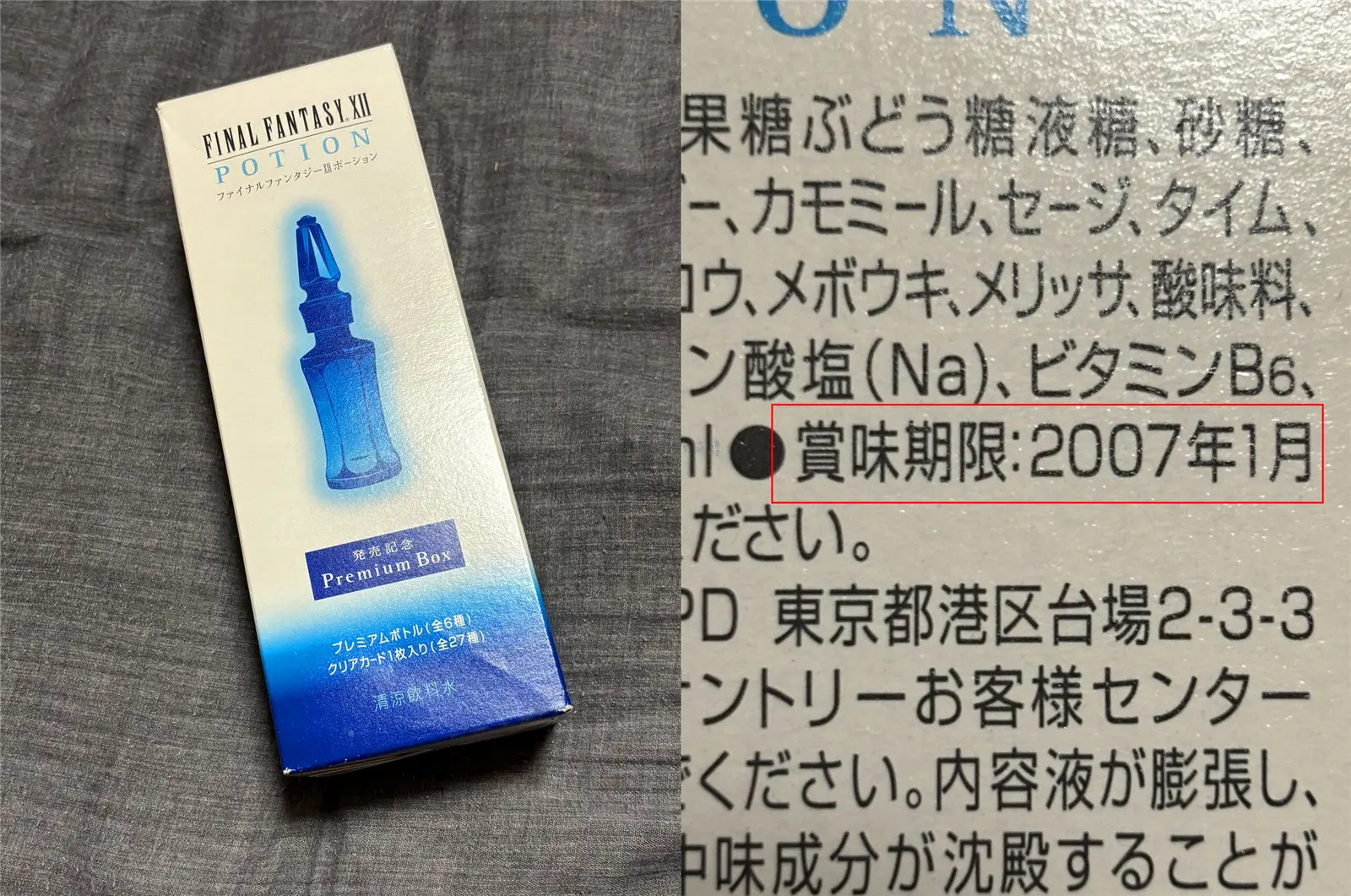 博士去研究了一下,发现这玩意和日本人气角色扮演游戏《最终幻想12(Final Fantasy XII)》有关。《最终幻想12》是史克威尔艾尼克斯公司为PlayStation 2开发的角色扮演游戏,于2006年发行。当年游戏官方还与知名饮料公司三得利合作,推出了包装仿造游戏中药水瓶的系列饮料。作为《最终幻想》铁杆粉丝,“赤野工作”也入手了该系列饮料。