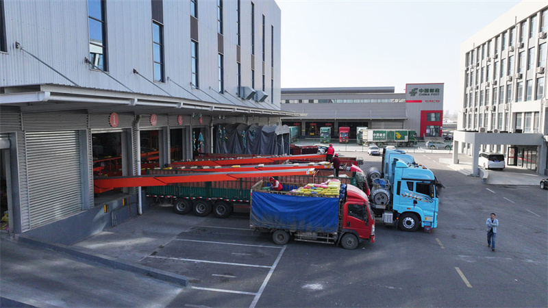 近日,在河北润沃智慧物流(邢台)产业园,义楠(河北)供应链有限公司工人将传送带上的宠物食品包裹装车。