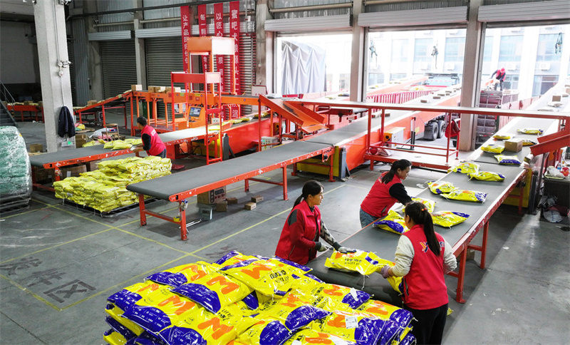 近日,在邢台市南和区义楠(河北)供应链有限公司仓库,工人根据订单将宠物食品包裹贴上标签放到传送带上。