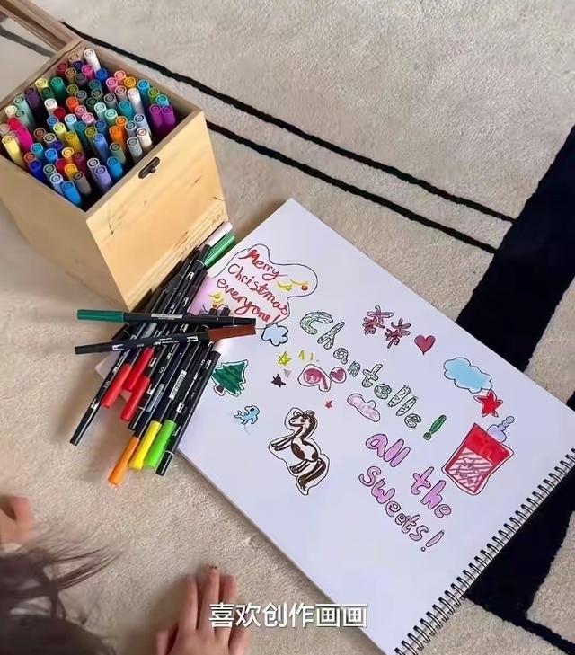镜头一转,大宝正趴在地上认真画画,各色画笔散落在身旁,小小的身影对着画纸写写画画,充满童真的奇思妙想。