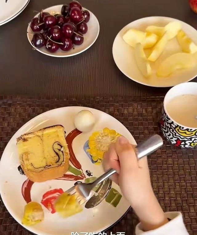 镜头中,方媛坐在餐桌旁,面前摆放着车厘子、苹果块等新鲜水果,看起来清爽又精致。她整个人状态松弛,和孩子们一起享受着安静的早餐时光。