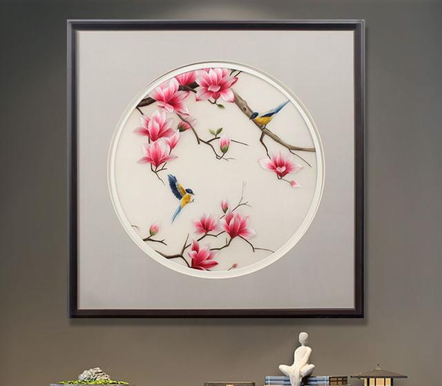 像这幅手工刺绣的方形玉兰图,画中朵朵玉兰花如同一位位优雅的仙子,静静的绽放在枝头间,带着玉堂富贵的清雅,也让人感受到一种宁静与和谐,在风的吹拂下,玉兰花轻轻摇曳,吸引了两只喜鹊闻香而来,更是构成了“喜上枝头”美好寓意。而且民间自古有着“玉兰花开,富贵不愁”的说法,挂在进门玄关位置,其内外兼修的魅力,能够让家人的心灵得到净化和升华,也让家充满和谐美满的喜气。