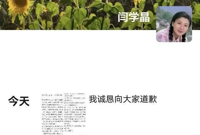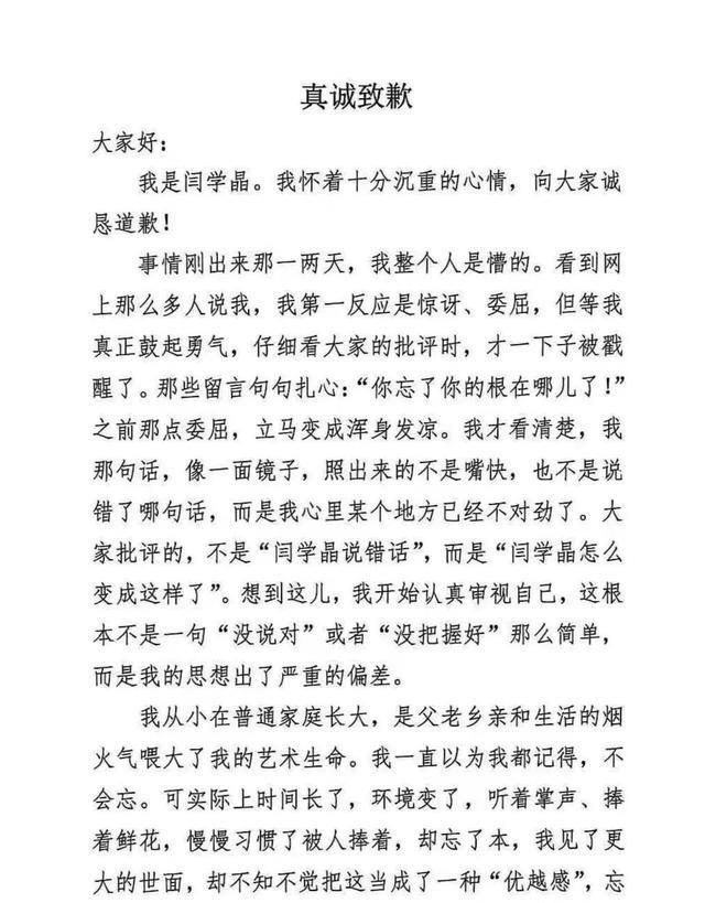 文中提到,“我是闫学晶。我怀着十分沉重的心情,向大家诚恳道歉!事情刚出来那一两天,我整个人是懵的。看到网上那么多人说我,我第一反应是惊讶、委屈,但等我真正鼓起勇气,仔细看大家的批评时,才一下子被戳醒了。”