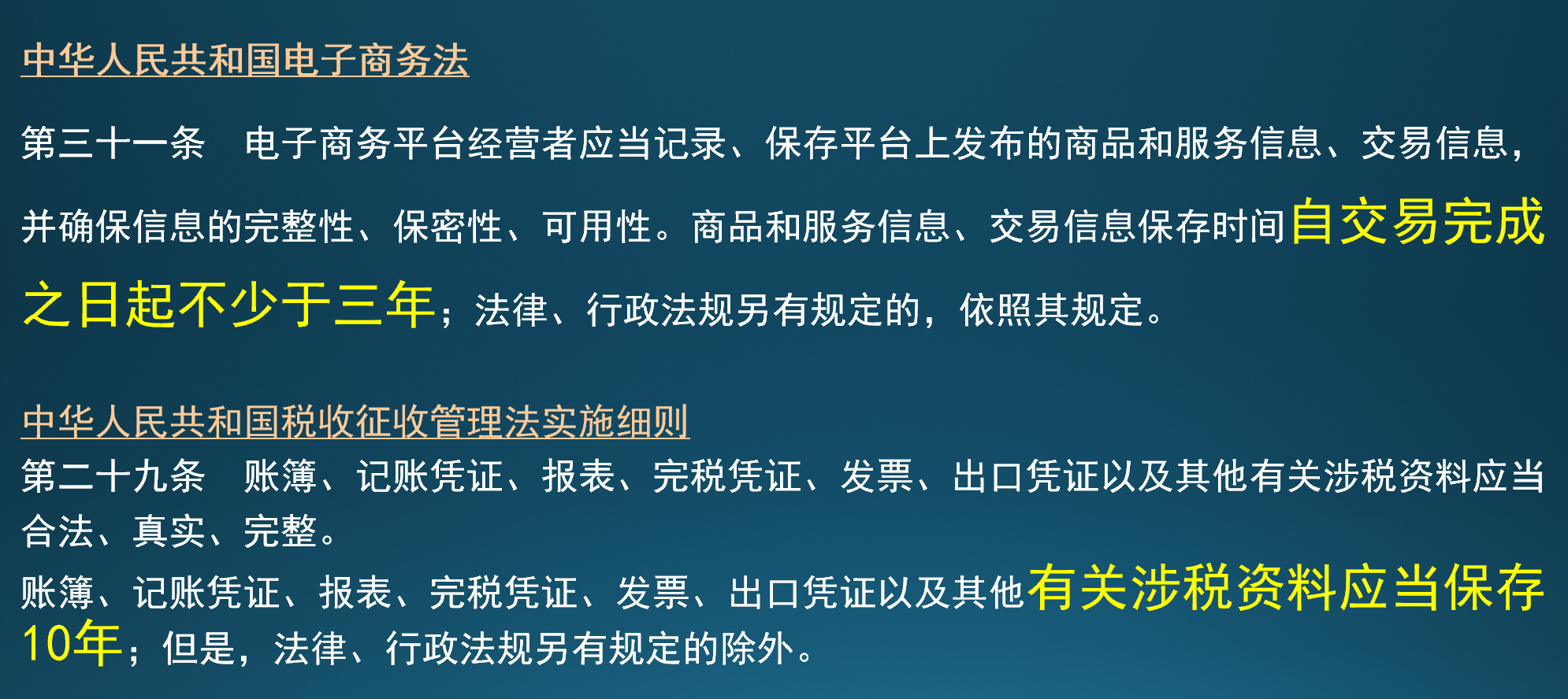 这也是一种错误的认识,因为在《电子商务法》第二十八条里同时还明确:“法律、行政法规另有规定的,依照其规定”。《征管法实施细则》就规定的非常明确,涉税资料要保存十年。其实对一些电商平台来说,他们出于自身经营的需要,平台上信息他们经常会保存得更久,这也是有利于税局对偷税无限期追征的。