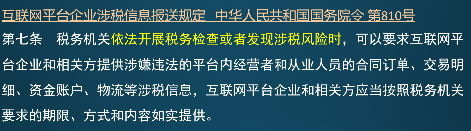 这种想法是完全错误的,规定的第七条非常明确,如果税局开展检查或发现涉税风险的时候,平台还是要根据税局要求提供平台上电商的涉税信息的。