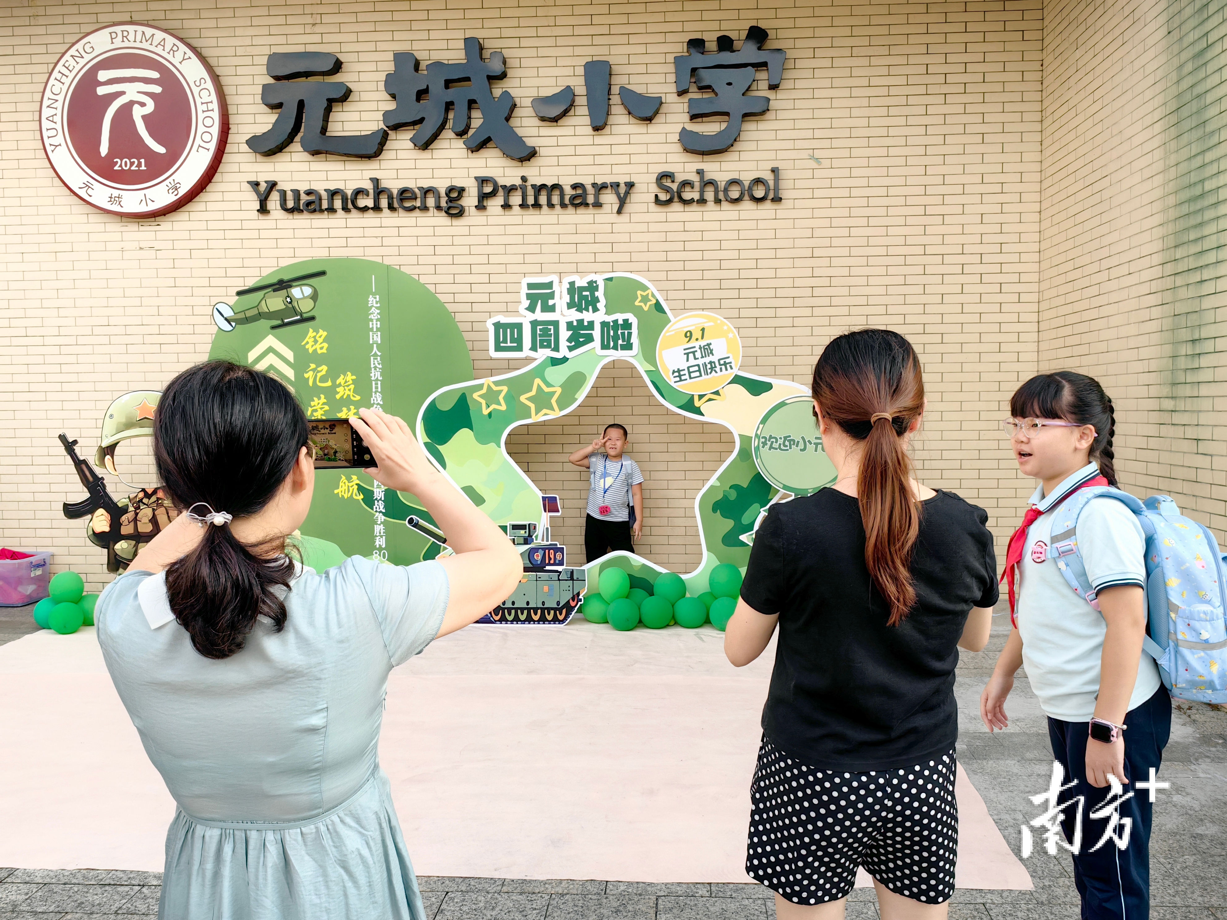今年正值中国人民抗日战争暨世界反法西斯战争胜利80周年,元城小学以此为教育契机,在校门口设置了以迷彩绿为主题色的“铭记荣光 筑梦起航”展板,供学生们打卡拍照,将爱国主义教育融入开学第一天。