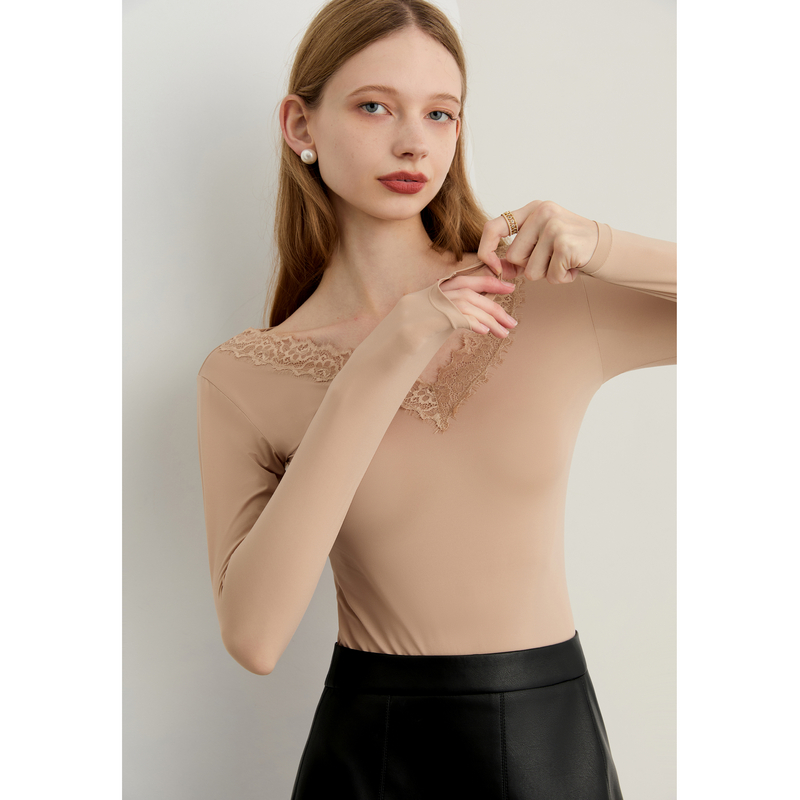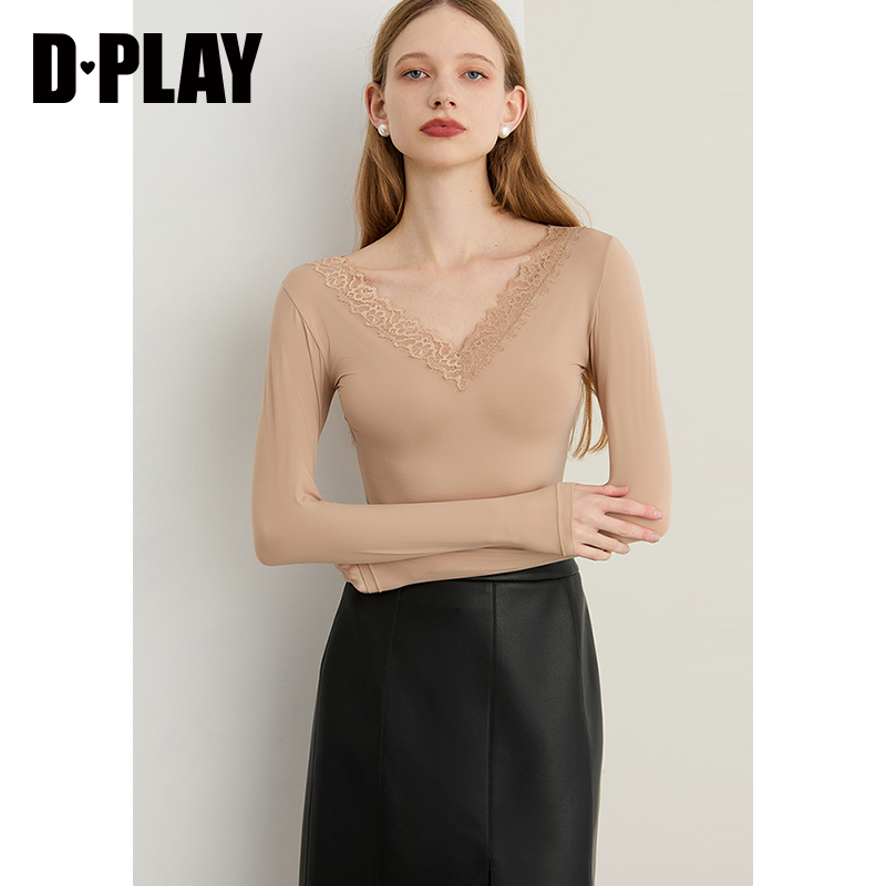 DPLAY2025秋季【惠品 粉底液皮肤衣】打底衫t恤女蕾丝领修身上衣,江苏 常州