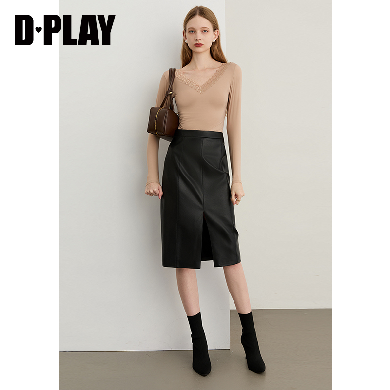 DPLAY2025秋季【惠品 粉底液皮肤衣】打底衫t恤女蕾丝领修身上衣