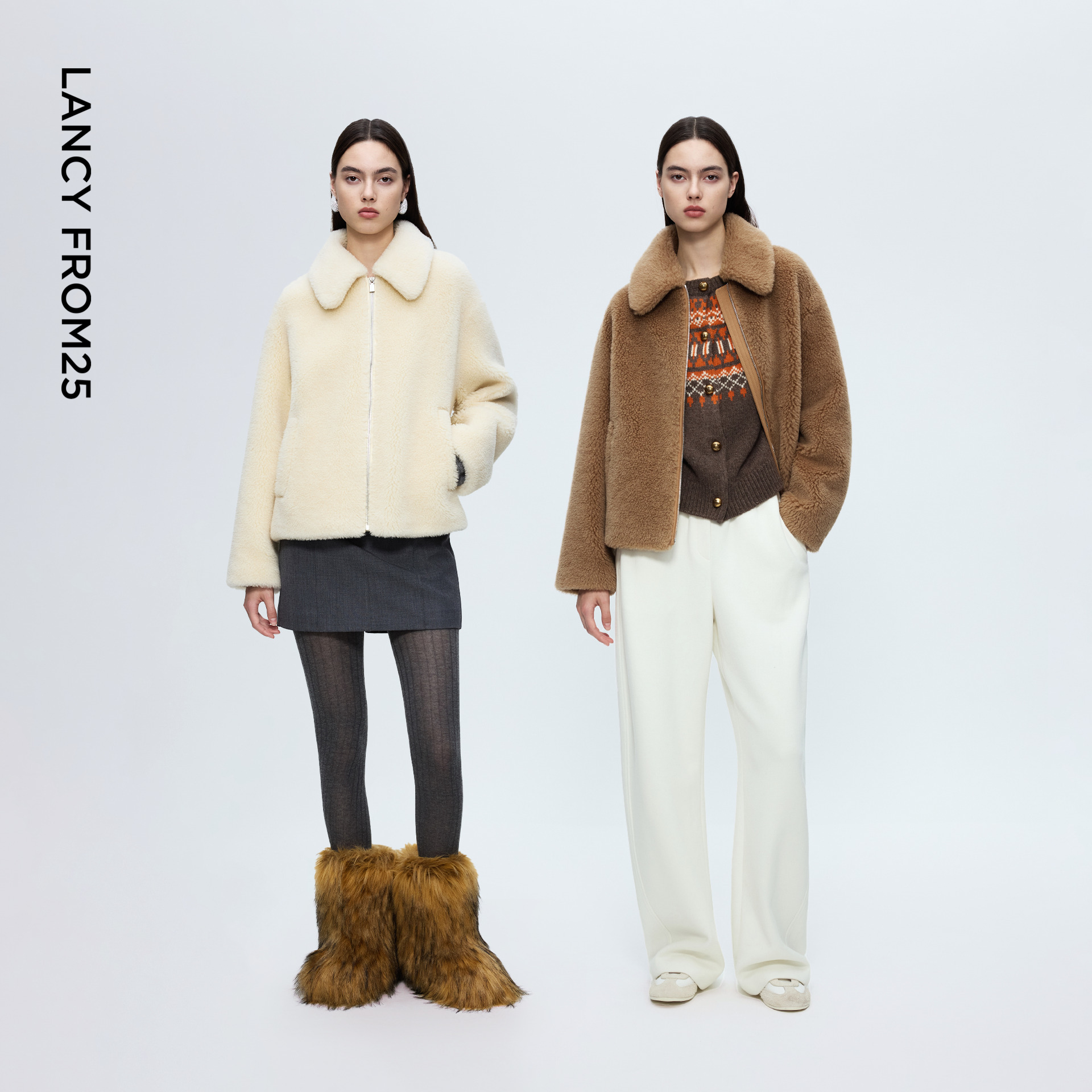 朗姿羊毛翻领气质仿皮草外套时尚通勤夹克上衣女2025年冬季新款