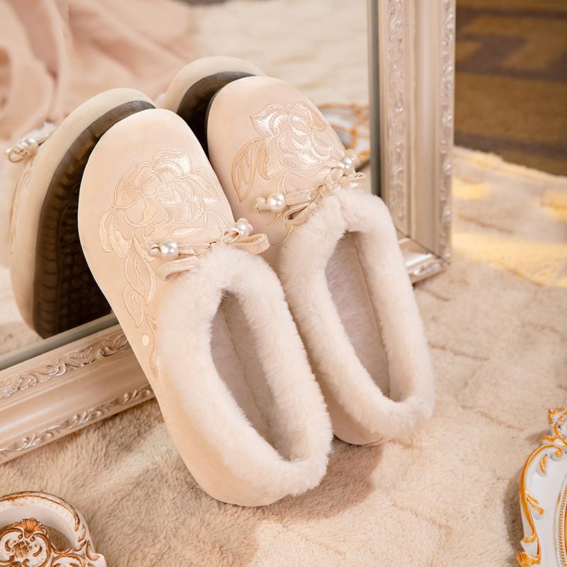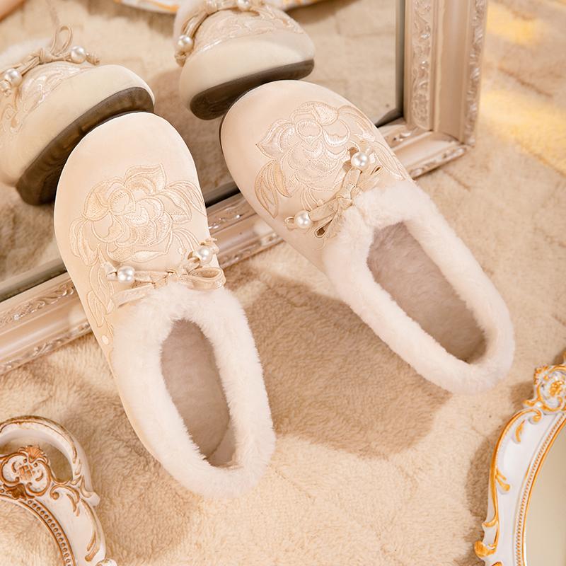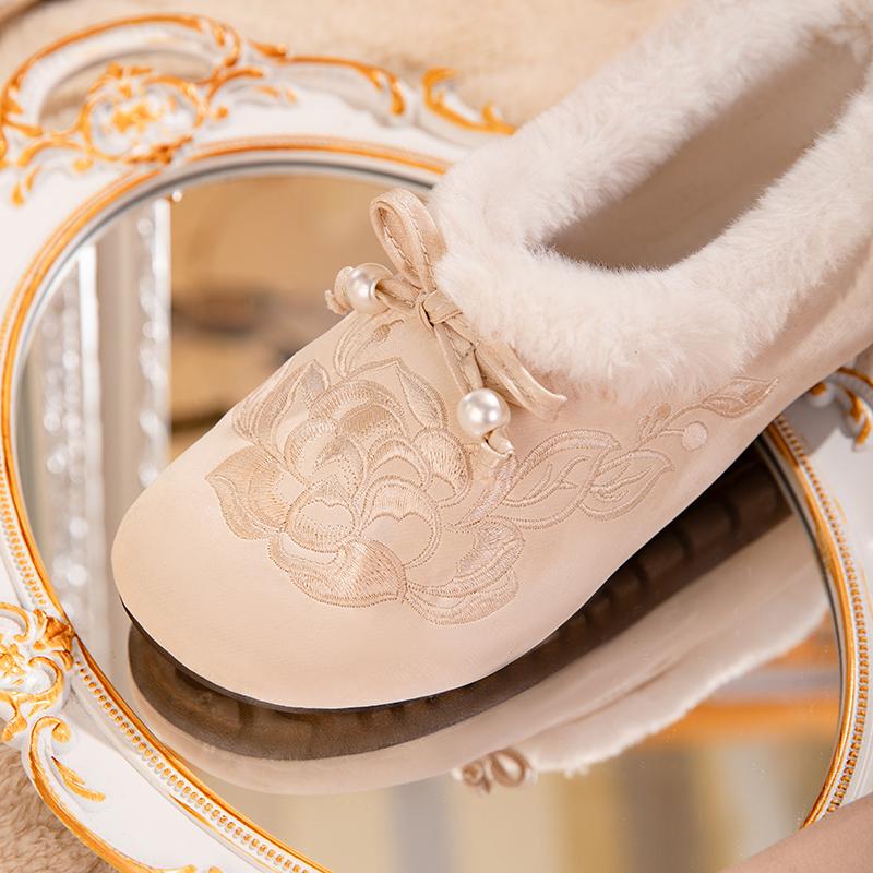 老北京布鞋女冬季加绒软底防滑一脚蹬妈妈鞋新中式国风绣花棉鞋,湖南 长沙