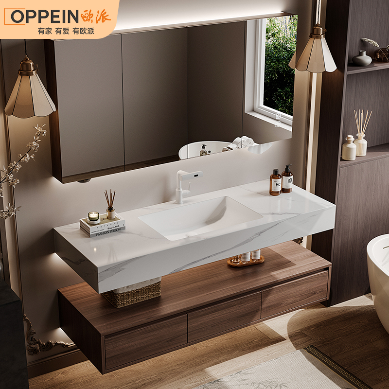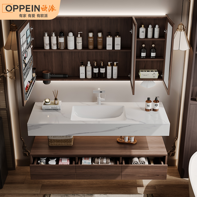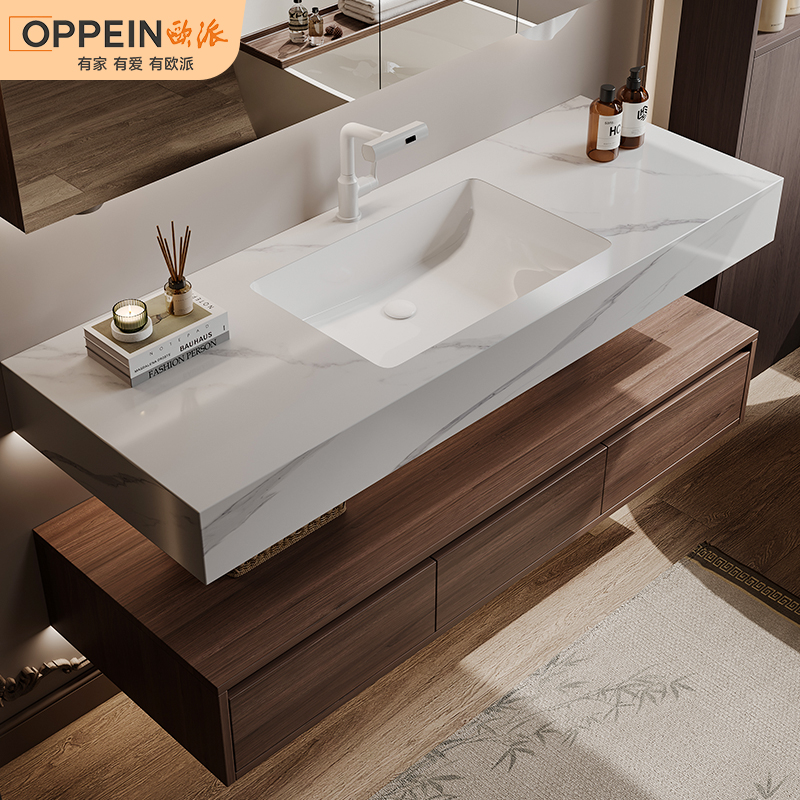 欧派中古风浴室柜组合热弯岩板无缝盆酒店风洗漱台胡桃木洗脸盆柜