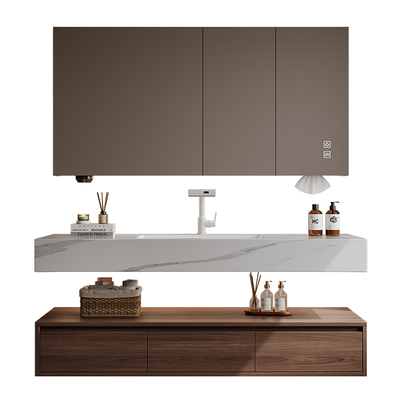 欧派中古风浴室柜组合热弯岩板无缝盆酒店风洗漱台胡桃木洗脸盆柜,浙江 杭州