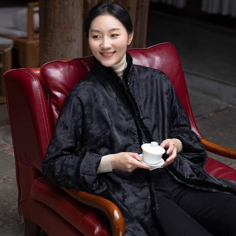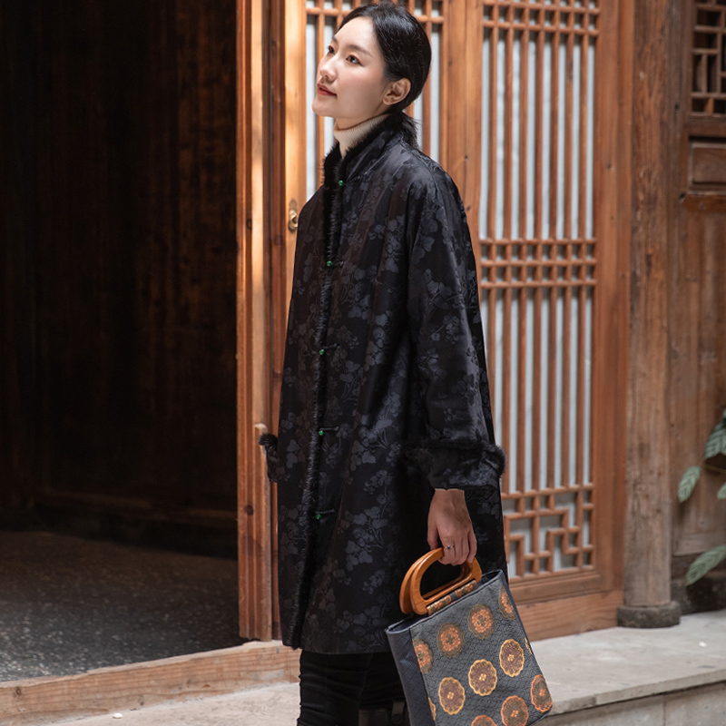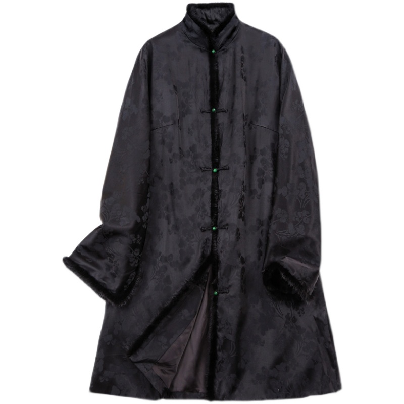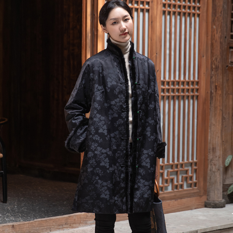 真丝提花中国风开襟貂毛中长款中式复古宽松冬棉衣大衣唐装女外套,北京