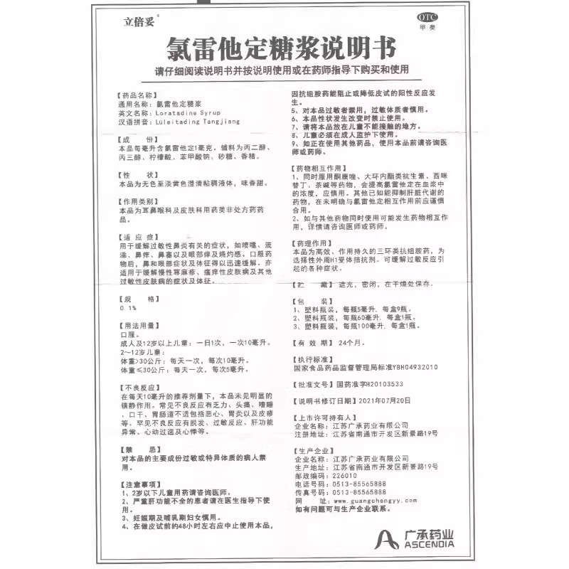 立倍妥 伊百芝 氯雷他定糖浆 100ml*1瓶/盒 慢性荨麻疹过敏性鼻炎,辽宁 营口