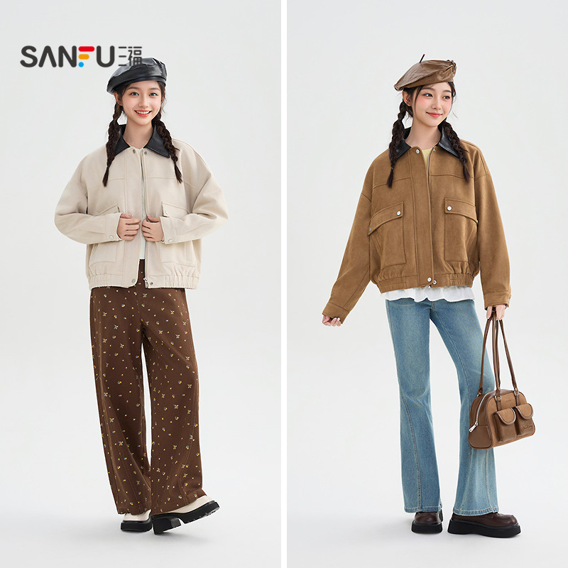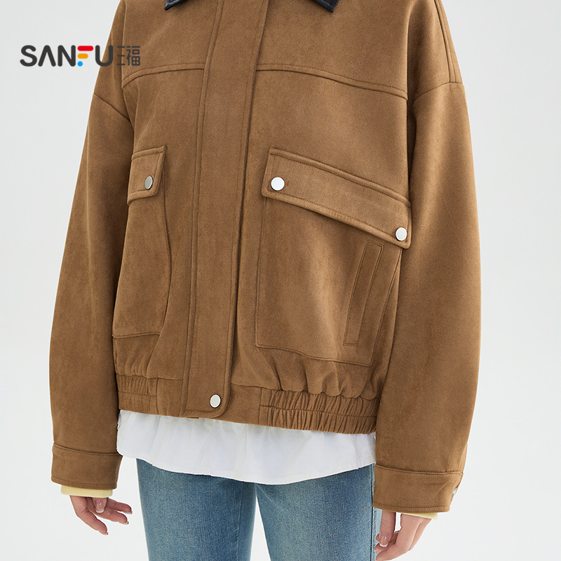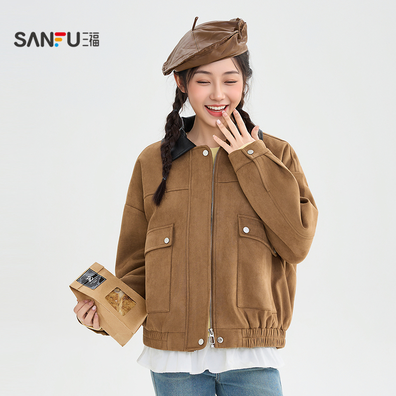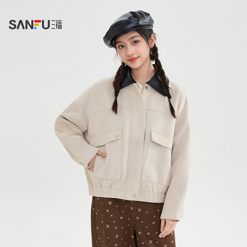 三福外套2025新款冬季复古拼接皮翻领松紧下摆宽松夹克女装510464,广东 广州