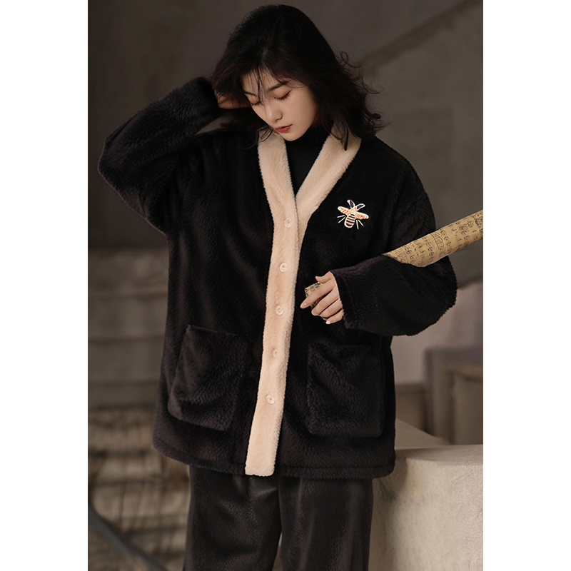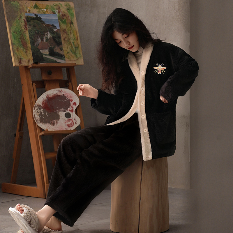 睡衣女秋冬款2024新款珊瑚绒黑色毛毛可外穿加厚大码胖mm家居服,广东 广州